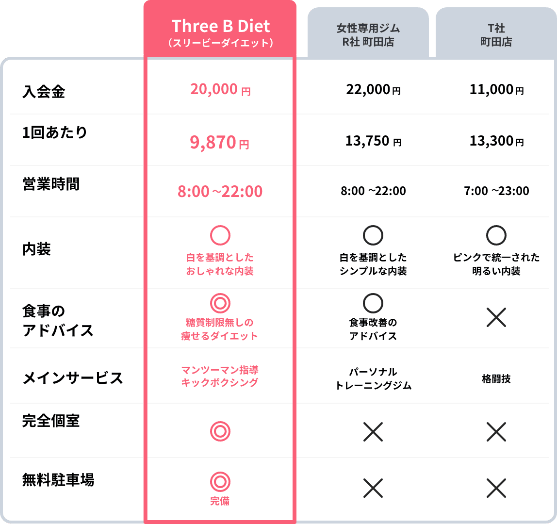 Three B Dietでは普段の生活習慣の改善を大切にしており、「リバウンドしないダイエット」をコンセプトにお客様に指導しております。生活習慣が良くなることでジム以外でのダイエット効果が高くなり、リバウンドしにくくなります。