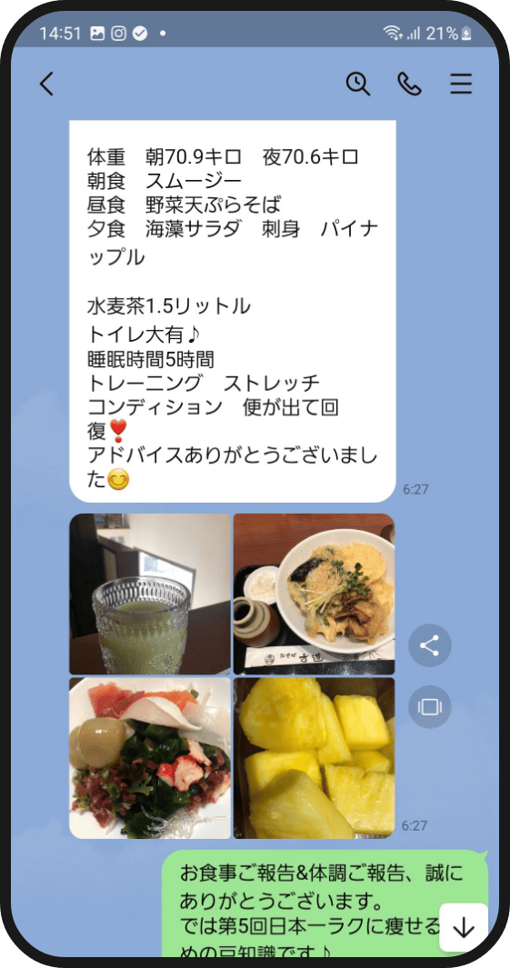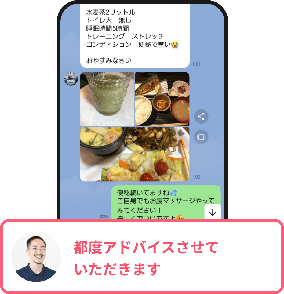 栄養学に詳しいパーソナルトレーナーが「食べて痩せる」食事アドバイスするので1人だとダイエットが続かない方でも、トレーナーと毎日コミュニケーションを取ることでモチベーションを維持できます。