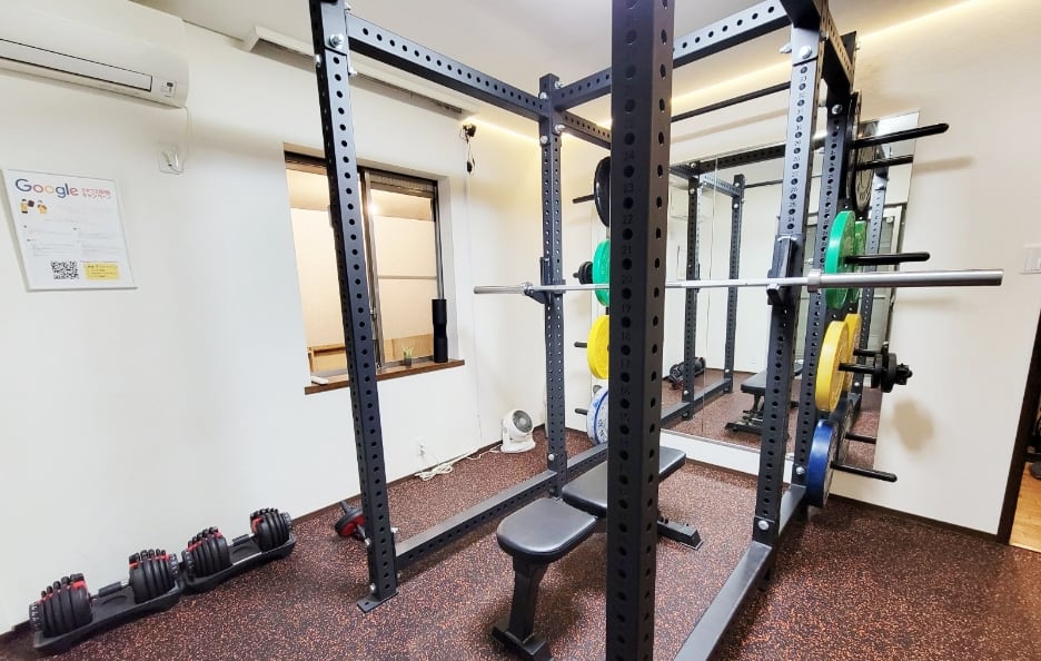 キックボクシングセッションを終えたお客様向けの、フリーウェイトのトレーニング設備もご用意(※ご希望の方のみ)